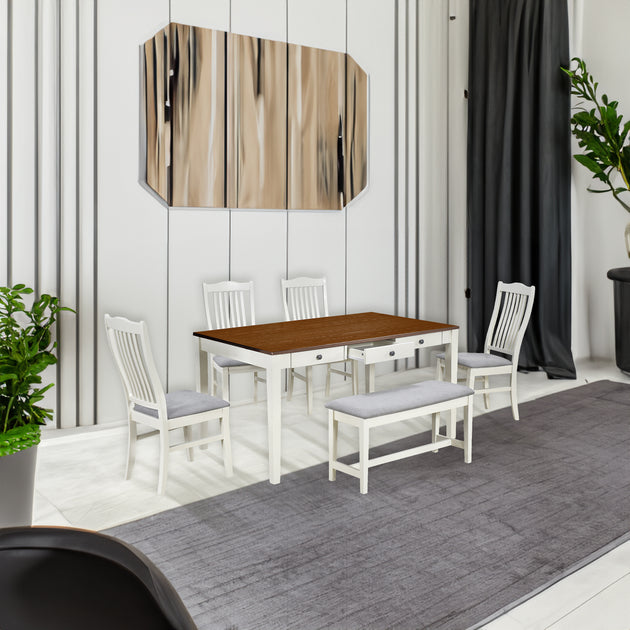 TOPMAX 6-Piece Wood Dining Table Set w/Upholstered Bench and 4 Dining Chairs